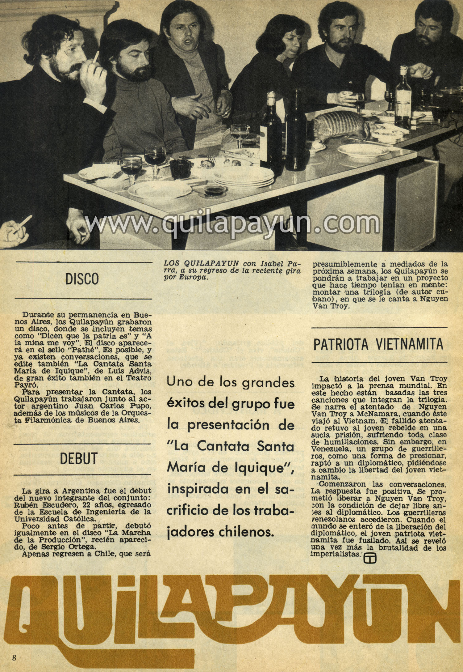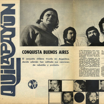 Los Quilapayún realizan estas presentaciones en Buenos Aires de acuerdo al programa de difusión de la música folklórica y de la nueva canción chilena que se está efectuando en el Teatro Payró. Anteriormente actuaron Isabel Parra, Rolando Alarcón y Angel Parra.